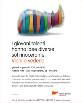 Come in un flash mob, solo per un giorno presso la galleria Rizziero Arte, saranno messi in mostra e premiati i lavori realizzati dai giovani talenti del liceo d’Arte Misticoni Bellisario di Pescara, che reinterpretano il simbolo storico dell’agenzia pescarese, il rinoceronte. Una figura emblematica che negli anni ha ispirato numerosi artisti da Dalì a Wharol, solo per citarne alcuni e come dimostra questa manifestazione continuerà ad ispirare le generazioni future.