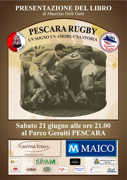 PESCARA – Sabato,21 giugno 2014,al Parco Gesuiti,in via dei Gesuiti n. 160 a Pescara sarà presentato il libro “Pescara Rugby. Un sogno,un amore ,una storia”,la storia del movimento rugbistico a Pescara dal 1968.