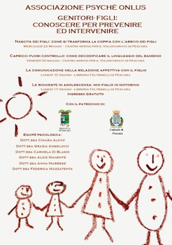 PESCARA – Si terrà a Pescara, nel periodo maggio-giugno 2013 , un Ciclo di seminari sul rapporto genitori-figli organizzato dall’Associazione Forensics Psychè ONLUS, e patrocinato dalla Provincia di Pescara e dal Comune di Pescara dal titolo: ” “Genitori- figli: conoscere per prevenire ed intervenire”.