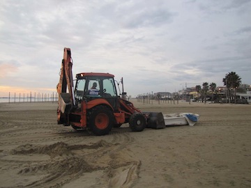 del disguido, affermando di aver ‘dimenticato’ quei mezzi e assicurando la loro veloce rimozione. E invece, tornati con la Polizia municipale a effettuare un nuovo sopralluogo, abbiamo verificato che quei natanti, o meglio ‘relitti’, sono ancora sulle nostre spiagge, abbandonati, rappresentando un elemento di degrado inconcepibile e inaccettabile: in molti casi quelle barche sono divenute una discarica, luogo di bivacco notturno per senzatetto e disperati, rappresentando un problema anche in termini di ordine pubblico, specie a fronte della riapertura degli stabilimenti balneari che sono motivo di attrazione per centinaia di giovani. Stamane, dopo una nuova serie di appelli e di ultimatum, è scattata l’operazione di rimozione forzata: alle 6 in punto sei unità della Attiva, con due ruspe e due scarrabili, hanno iniziato a rimuovere gli 11 natanti trovati sulla spiaggia, soprattutto a ridosso del confine con lo stabilimento balneare Jambo, tra cui anche un catamarano e imbarcazioni coperte con dei teloni impermeabili, dunque mezzi non in cattivo stato che però sono stati inesorabilmente abbandonati. Dall’interno di due natanti sono anche saltati fuori anche due senzatetto, che avevano trascorso la notte a bordo dei