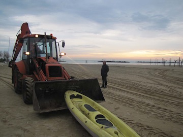 mezzi, coperti dai teloni, utenti che in tutta fretta hanno raccolto le proprie cose, racchiuse in un paio di borsoni, e si sono allontanati. Tutti i natanti sono stati trascinati sino al muretto di spartizione tra il marciapiede e la spiaggia e poi sono stati caricati con il ragno a bordo degli scarrabili dopo essere stati spezzati, quindi sono stati portati in discarica presso un impianto dell’impresa Mantini. Inoltre rimossi i mezzi la Attiva ha effettuato la bonifica totale di tutta la spiaggia libera e anche del piccolo cottage di legno bianco installato dal Comune e in estate affidato in gestione a una cooperativa. Sotto l’impalcato del cottage sono state ritrovate oltre un centinaio di bottiglie di birra vuote, bottiglie in vetro ovviamente abbandonate su una spiaggia trasformata in discarica, e poi sono stati raccolti corde, buste di rifiuti di ogni genere, materiale in plastica, vecchi indumenti, materiale in alcuni casi trascinato a riva dalle mareggiate, ma in molti altri casi abbandonato da disperati. L’intervento di bonifica e ripristino in sicurezza dell’arenile verrà completato domani da una squadra della Attiva mentre le sei unità odierne, con ruspe e scarrabili, si trasferirà qualche metro più a sud, sul lungomare Matteotti, dinanzi all’Hotel Salus, per proseguire la rimozione forzata di altre imbarcazioni abbandonate sulla spiaggia libera e anche in questo caso le spese sostenute verranno poi recuperate sui proprietari dei mezzi.