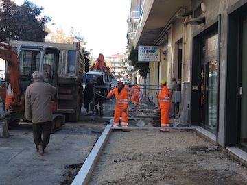 etto – andremo a individuare e realizzare delle zone di sosta con l’inserimento di panchine in cemento e piantumazioni, realizzando anche una struttura metallica denominata ‘albero’, alta 4 metri e mezzo, formata da tre pilastri inclinati e una struttura in rete metallica in cima che avrà la funzione di segnalare il punto di sosta, e fornire l’ombra necessaria al fine di rendere utilizzabile l’area anche nelle calde giornate estive, una struttura ovviamente dotata anche di punto luce che si illuminerà al calare del buio. Caratteristica anche la scelta della pavimentazione in diversi colori con disegni a terra, ma, ed è qui la novità importante, utilizzeremo soprattutto un materiale con finitura fotocatalitica, ossia Biossido di Titanio che, sotto l’azione dei raggi solari, sviluppa un’azione capace di decomporre gli elementi inquinanti presenti nell’atmosfera, con un abbattimento del 30 per cento del Pm10 e dell’80 per cento degli altri inquinanti. Dunque i 4mila metri quadrati di nuova pavimentazione diventeranno una sorta di polmone ecologico, capace di purificare 1milione di metri cubi d’aria ogni 10 ore di irraggiamento. Inoltre tutta la pavimentazione avrà una granulometria tale da essere permeabile rispetto alle acque piovane. Veniamo poi all’arredo urbano: innanzitutto abbiamo previsto l’installazione dei percorsi per ipovedenti con il sistema Loges; quindi panchine nelle zone centrali di via Benedetto Croce e piazza Salvo D’Acquisto; cestini portarifiuti e rastrelliere portabici; gli attraversamenti stradali in corrispondenza di via Marconi, via Milli, via Benedetto Croce, e piazza Salvo D’Acquisto avranno una fila di 15 punti luce carrabili a led, con funzione di segnapassi; e in corrispondenza di via Milli e via Guelfi sono previste due isole ecologiche dimensionate per racchiudere più contenitori per i rifiuti, ma progettate per la parziale occlusione delle stesse per garantire un’attenzione estetica alla zona, dunque isole che saranno realizzate con pareti in lamiera microforata. Infine andremo a integrare le essenze arboree esistenti, arricchendo le aiuole con erba di piccolo taglio e piante ornamentali. l’appalto è stato aggiudicato all’impresa Md Costruzioni Srl di Pescara, per un importo pari a 307mila 65,76 euro e l’impresa avrà 180 giorni per completare le opere. L’appalto, che dovrà concludersi entro il prossimo 5 maggio – ha concluso il sindaco Albore Mascia -, procederà per lotti per ridurre al minimo i disagi per la popolazione, e sino al prossimo sabato 15 febbraio interesserà la prima parte, dove è stato istituito il divieto di fermata e di sosta su entrambi i lati della corsia lato sud di via Mazzarino, nel tratto compreso tra via Marconi e sino all’incrocio con via Benedetto Croce. Inoltre abbiamo revocato gli stalli per disabili situati in via Mazzarino, all’altezza dei civici 8, 23, 57 e 74: i primi tre sono stati recuperati in via Milli; gli altri due in via Valignani, posti validi sino al prossimo 5 maggio”.