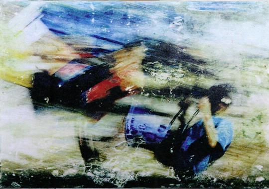 Fatalità, illusorietà, transitorietà, dentro immagini confuse che ne contengono altre, o sovrapposte ad altre in atmosfere mai aggressive, ma crudeli come il destino, in cui c’è l’uomo, disegnato con forme circolari labirintiche o in abbracci, incontri, combinazioni, separazioni, frantumazioni, fughe, e ci sono gli oggetti del presente: frutta, scatole, reti, vetrate, automobili, insegne, graffiti in paesaggi urbani con un cielo lontano.