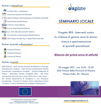 PESCARA – Oggi, 20 maggio, dalle ore 8.30 alle ore 13.30,nella sala Tinozzi della Provincia di Pescara in piazza Italia 30 verrà reso noto il bilancio del primo anno del progetto “IRIS”, che riguarda la violenza di genere verso le donne italiane e migranti e si occupa non solo di effettuare una ricerca in questo campo particolare ma anche di sperimentare degli sportelli specializzati per fornire un aiuto concreto alle donne e giovani vittime di violenza.