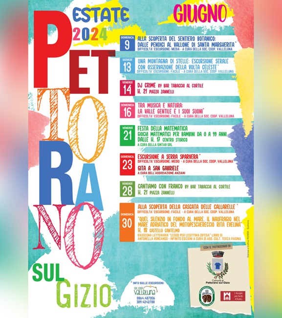 PETTORANO SUL GIZIO – È stato pubblicato il calendario delle manifestazioni, eventi culturali e sportivi che animeranno, a giugno, l ‘estate 2024 di Pettorano sul Gizio.