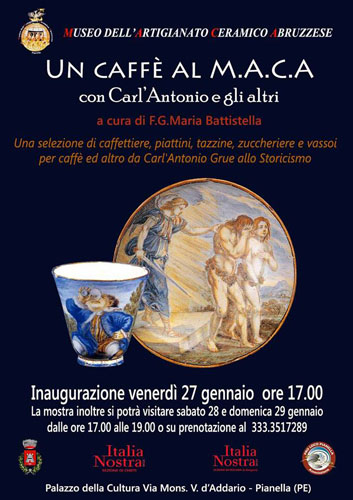 ore 17.00, nel M.A.C.A. (Museo dell’Artigianato Ceramico Abruzzese) di Pianella, Domenico Valente e Giancarla Armidi, rispettivamente presidenti di Italia Nostra di Pescara e Chieti, inaugureranno “Un caffè al MACA con Carl’Antonio e gli altri”, mostra a cura di Franco G. Maria Battistella.