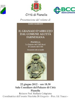 PIANELLA (PE) – Oggi, 22 giugno, alle ore 18.00, presso la Sala Consiliare del Palazzo di Città, a Pianella, si terrà la presentazione dell’opera “Il granaio d’Abruzzo dal Comune all’Età Farnesiana” di Eliseo Marrone, con il sostegno della Regione Abruzzo, del Comune di Pianella e del Credito Cooperativo.