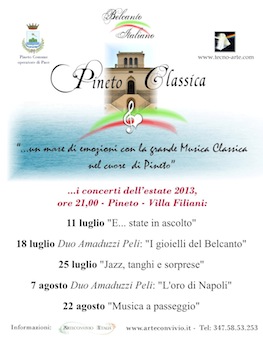 PINETO (TE) – Si accende l’estate a Pineto con la grande Musica Classica. “Pineto Classica” è il nome del cartellone che raccoglie ben 5 appuntamenti che si svolgeranno nei mesi di luglio e agosto presso la Villa Filiani alle ore 21 e con ingresso libero. Questa sera primo concerto con “E… state in ascolto”, a seguire il 18 luglio “I gioielli del Belcanto” (Duo Amaduzzi Peli), il 25 luglio “Jazz, tanghi e sorprese”, il 7 agosto “L’oro di Napoli” Duo Amaduzzi Peli ed il 22 agosto “Musica a passeggio”.