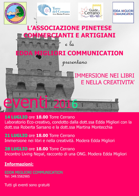 “Immersione nei libri e nella creatività” organizzato a Torre Cerrano dall’Associazione Pinetese Commercianti e Artigiani ed Edda Migliori Communication con AMP Torre del Cerrano ed Associazione Guide del Cerrano.