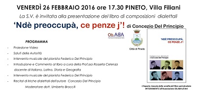 PINETO (TE) – Venerdì 26 febbraio dalle ore 17:30 presso Villa Fabiani a Pineto appuntamento con la poesia dialettale con “Ndè preoccupà, ce penze j'” di Conzio Del Principio. Moderatore dell’incontro sarà il dott. Umberto Braccili.