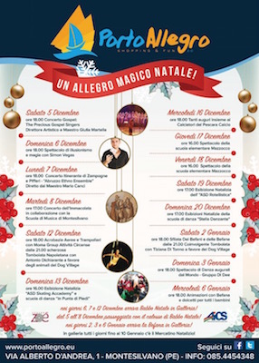 MONTESILVANO (PE) – Il concerto Gospel; il grande illusionismo di Simon Vegas; le più belle melodie degli zampognari; il tradizionale concerto dell’Immacolata; i trampoli e le acrobazie aeree con i tessuti; le incantevoli danze augurali dal mondo; gli abbracci e le foto con Babbo Natale; gli autografi e la simpatia dei calciatori della Pescara Calcio; le scherzose tombolate napoletane di beneficenza per gli animali del Dog Village; le esibizioni delle scuole e delle associazioni di Montesilvano; le spassose sfilate dei befani e delle befane; i clown e i giri con il calesse con Babbo Natale: insomma tanti eventi per passare insieme momenti gratuiti per tutti, davvero belli e coinvolgenti, grazie a Porto Allegro di Montesilvano, Centro Zoé e Aics Abruzzo.