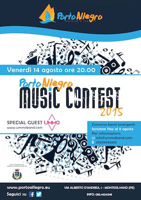 MONTESILVANO (PE) – Venerdì 14 agosto, a partire dalle ore 20 circa, si svolgerà una vera e propria sfida musicale per i talenti emergenti del territorio e non solo. Band emergenti con un repertorio di musica inedita. E’ aperto a loro il “Porto Allegro Music Contest 2015”, organizzato da Cristiano Romanelli, in collaborazione con il Comune di Montesilvano e il centro di intrattenimento Porto Allegro. L’evento sarà presentato dalle conduttrici Nadia Monaco e Luna Bortoli. La giuria sarà composta da Gabriella Ciaffarini, da due produttori musicali, Paolo Tocco e Giulio Berghella, da giornalisti, e recensori di web magazine. Ogni esibizione avrà una durata di 20 minuti. Prima della premiazione saliranno sul palco gli Ummo. Per partecipare c’è tempo fino alla mezzanotte del 9 agosto. I gruppi dovranno inviare una mail a info@ummoband.com, allegando biografia, 2 foto, alcuni brani del proprio repertorio, contatti e un video.