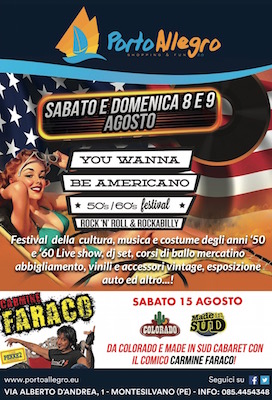 «Sono onorato di essere qui e di aver collaborato con l’Amministrazione Comunale su questi eventi. Il centro di intrattenimento sta vivendo una fase di rilancio e di nuova vitalità. Questa linfa vuole essere il filo conduttore di tutti i nostri eventi, inclusi i due che abbiamo organizzato con la collaborazione del Comune. Porto Allegro deve diventare una nuova piazza di Montesilvano. Sabato e domenica si terrà “You Wanna Be Americano”, il festival dedicato alla cultura americana e italiana anni ’50. A partire dalle 20 di domani e nella serata di domenica si esibiranno gruppi musicali anni ’50. «Abbiamo cercato di coinvolgere tutte le attività commerciali del centro. Vi saranno lezioni di ballo, spazi dedicati ai tatuaggi, al trucco e parrucco per diventare pin up, angoli fotografici ed esposizioni di auto d’epoca. Speriamo così di riuscire a coinvolgere tutte le età».