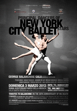Infatti domenica 3 marzo 2013 alle ore 21,00 la Fondazione Musica per Roma, in collaborazione con Daniele Cipriani Entertainment, presenta per la prima volta la grande danza classica nella Sala Santa Cecilia, tempio della musica: George Balanchine Gala. Protagonisti della serata, oltre alle meravigliose coreografie, saranno alcuni fra i più brillanti principals del prestigioso New York City Ballet: Ashley Bouder, Megan Fairchild, Teresa Reichlen, Ana Sophia Scheller, Tyler Angle, Joaquin De Luz, Gonzalo Garcia, Amar Ramasar, Andrew Veyette.