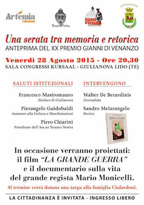 ato da Alberto Sordi e Vittorio Gassman. Il film sarà proiettato nel centro congressi Kursaal di Giulianova Lido venerdì 28 agosto alle 20:30. Oltre al capolavoro di Monicelli, sempre lo stesso giorno a Giulianova sarà proiettato anche il documentario “Monicelli – La versione di Mario”, film del 2012 diretto da cinque registi: Annarosa Mori, Mario Gianni, Wilma Labate, Felice Farina e Mario Canale. Prima del film prenderanno la parola per un saluto istituzionale, il Sindaco di Giulianova Francesco Mastromauro, l’Assessore alla cultura Pierangelo Guidobaldi, lo storico Sandro Melarangelo per Teramonostra, Sandro Galantini, storico e autore dell’introduzione al libro con la biografia di Francesco Manocchia e il giornalista Walter De Berardinis autore delle ricerche dei caduti giuliesi della 1° guerra mondiale. Al termine della manifestazione, verrù consegnata una targa alla famiglia Ciafardoni.