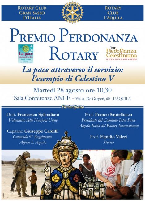 I due club Rotary della città dell’Aquila (Rotary L’Aquila e Rotary L’Aquila Gran Sasso d’Italia) da diversi anni assegnano il premio in occasione della Perdonanza Celestiniana. Il premio viene assegnato alle persone fisiche o alle istituzioni che si sono particolarmente distinte in attività umanitarie e che abbiano svolto un ruolo di primo piano in favore della collettività. Il premio è stato assegnato alla Comunità di S. Egidio proprio in considerazione dell’attività umanitaria e di soccorso ai soggetti più deboli e indigenti e di promozione della pace tra i popoli e le diverse confessioni religiose che questa organizzazione persegue. In perfetta sintonia con gli insegnamenti e le opere di Papa Celestino V.
