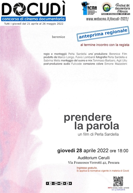 Giovedì 28 aprile verrà proiettato “Prendere la parola” regia di Perla Sardella, la storia di alcune donne extracomunitarie attraverso l’apprendimento della lingua italiana. Al termine della proiezione la regista risponderà alle domande del pubblico.