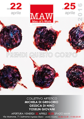 SULMONA (AQ) – Venerdì 22 aprile, alle ore 18.30, il Laboratorio d’arte MAW presenta un nuovo evento espositivo con la mostra PRENDI QUESTO CORPO, un progetto artistico sul tema della sessualità che segna l’esordio del Collettivo formato dalle artiste Gessica Di Nino e Yoselin Giovani e dalla scrittrice Michela Di Gregorio.