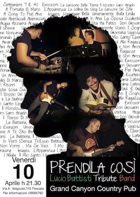 BIO – “Prendila Così” é una cover band di Lucio Battisti nata da quasi un decennio. Il nome rimanda ad una sua canzone scritta insieme a Mogol, ed é tratta dall’album:” Una donna per amico” del lontano 1978.La scelta, comunque, vuole essere anche un invito a non prendersi troppo sul serio: il cantante indossa una parrucca e dei baffi finti che fanno un po’il verso al “primo” Battisti.Il gruppo base é composto da 5 elementi: Paolo De Carolis,chitarra accompagnamento e voce; Antonio Falasca batteria;Flavio De Carolis, chitarra solista;Marcello Di Credico, tastiere; …Valerio De Carolis, basso elettrico. Il repertorio é ricco e variegato con incursioni in tutte le raccolte relative, pero, solo al mitico ed indimenticabile binomio artistico: Mogol/ Battisti. Nel corso dello spettacolo le canzoni eseguite vengono introdotte da un breve cenno sulla loro genesi e con qualche richiamo ai principali fatti di cronaca di quel periodo storico anche attraverso un maxi-schermo, sempre alimentato da immagini originalissime. I brani, pur mantenendo una certa fedeltà con gli originali, sono stati rielaborati in chiave moderna con numerose contaminazioni Rock e Blues, da non trascurare poi che la voce solista ricorda tantissimo quella davvero inimitabile del genio di Poggio Bustone. Raccontare e rivivere le emozioni degli anni ’60/’70 e ’80 con la colonna sonora dei brani scritti dalla coppia d’oro Mogol/Battisti ricostruendone anche i tempi attraverso una rapida rilettura giornalistica dei principali fatti di cronaca.