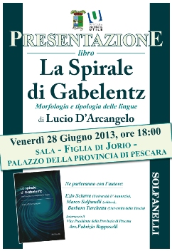 PESCARA – Domani,28 Giugno alle ore 18.00, nell’ambito degli Incontri in Biblioteca, presso la Sala Figlia di Jorio del Palazzo della Provincia di Pescara,si terrà la presentazione del libro “La Spirale di Gabelentz” Morfologia e tipologia delle lingue di Lucio D’Arcangelo (Edizioni Solfanelli).