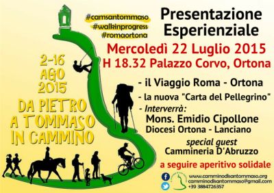 ORTONA (CH) – Mercoledì 22 Luglio alle ore 18.32 presso Palazzo Corvo di Ortona alla presenza del Vescovo di Ortona – Lanciano, Mons. Emidio Cipollone e le autorità comunali e regionali, sarà presentato il programma della terza edizione del pellegrinaggio “Da Pietro a Tommaso, In Cammino”. Dopo l’inaugurazione del Cammino nel 2013 giunta agli onori della cronaca nazionale grazie alla speciale benedizione riservata da Papa Francesco nel famoso Angelus del 9 Giugno, e dopo la conferma dello scorso anno con l’inversione della rotta che vede definitivamente Ortona e le spoglie di San Tommaso Apostolo come meta del pellegriviaggio, quest’anno si torna a camminare con la solita formula “equo-solidale” ma con tante novità all’interno del programma.