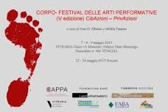 PESCARA – Lunedì 4 maggio, alle ore 11.30, presso l’Appartamento LAGO (Palazzo UZA), lungo corso Vittorio Emanuele II (IV piano), si terrà la conferenza stampa di presentazione della V edizione di CORPO – Festival delle Arti Performative a cura di Ivan D’Alberto e Sibilla Panerai. Quest’anno la rassegna avrà come tema CibAzioni – PrivAzioni e prenderà il via in concomitanza con l’apertura della Biennale di Venezia il 7, 8 e 9 maggio 2015 presso lo storico palazzo veneziano Nani Mocenigo, sede di VITRARIA Glass +A Museum e proseguirà a Pescara il 23 e 24 maggio.