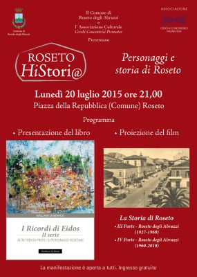 ROSETO DEGLI ABRUZZI (TE) – Lunedi 20 luglio alle ore 21.00 in piazza del Comune sarà presentato il libro ” I Ricordi di Eidos – II serie” (Verdone Editore) di William Di Marco. Sarà la festa del senso di appartenenza al luogo in cui si vive. L’evento darà motivo a molti rosetani di trovarsi insieme per ricordare alcuni dei personaggi della contemporaneità che hanno dato un contributo alla crescita cittadina. Come sottolineò l’autore già alla presentazione del primo volume (I Ricordi di Eidos) avvenuto all’inizio del 2014, tantissimi sarebbero coloro che meriterebbero un profilo, perché Roseto, nonostante la sua giovane età, ha dato modo a molte persone di mettersi in mostra nei vari campi dei mestieri, delle professioni, dell’insegnamento, delle varie attività intellettuali, del mondo dell’impresa, dei lavoratori, degli operai e tanti altri che, grazie al loro lavoro e attraverso le varie esperienze, si sono distinti in uno specifico campo.