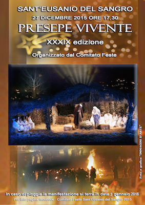 SANT’EUSANIO DEL SANGRO (CH) – Domenica 27 dicembre alle ore 17.30 si svolgerà a Sant’Eusanio del Sangro (CH) la XXXIX edizione del Presepe Vivente a cura dal Comitato Festa. In caso di pioggia la manifestazione si terrà il 3 gennaio 2016.