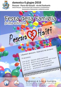 Una grande Festa della Famiglia dedicata ai bambini che, con un piccolo contributo, aiuteranno, senza saperlo, centinaia di altri piccoli di Haiti colpiti dall’immane tragedia del terremoto e per i quali Pescara ha deciso di mobilitarsi promuovendo una lunga serie di iniziative di solidarietà che dureranno un anno. Il primo appuntamento è per domenica prossima, 6 giugno, a partire dalle 15 presso il Parco dei Gesuiti per giocare con mamma, papà e i bambini stessi.