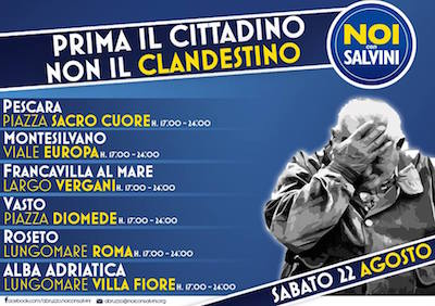 PESCARA – Oggi, sabato 22 agosto, giornata conclusiva dell’iniziativa di Noi con Salvini Abruzzo: “Prima il cittadino, Non il Clandestino”. Dalle ore 17.00 alle 24.00, su tutta la costa abruzzese saranno allestiti gazebo e banchetti informativi, in cui saranno disponibili i moduli per la richiesta di un sussidio economico per i cittadini italiani che versano in condizioni di disagio, proprio sullo stesso modello di quanto lo Stato fa per i migranti.