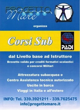 CHIETI – Progetto Mare ASD di Chieti organizza corsi subacquei per ambosessi da 9 a 80 anni di età. Un’interessante opportunità per gli amanti del mare che potranno cosi acquisire il brevetto PADI. Si tratta di una prima didattica subacquea mondiale, viene rilasciato a fine corso ed è riconosciuto per i punteggi nei concorsi militari e come crediti formativi scolastici, valevole in tutto il mondo. Le lezioni si svolgeranno in aula per la parte teorica, in piscina per la parte pratica in acque confinate. Successivamente sono previste quattro immersioni in mare. Tutte le attrezzature sono fornite per lo svolgimento del corso (Gav – erogatori doppi – manometro –profondimetro – cintura di zavorra – bombola).