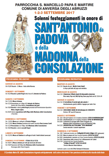 ANVERSA DEGLI ABRUZZI (AQ) – Sta per concludersi ad Anversa l’attesa dei festeggiamenti in onore si Sant’Antonio da Padova e della Madonna della Consolazione, comprotettrice del paese.