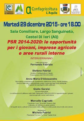 CASTEL DI IERI (AQ) – Per iniziativa del Comune di Castel di Ieri, La Pro Loco, partner dell’ Ecomuseo d’Abruzzo e la Confagricoltura, si svolgerà un incontro martedì 29 dicembre alle ore 18.00, presso la Sala Consiliare del grazioso borgo sirentino, finalizzato ad illustrare ai giovani agricoltori le opportunità offerte dai fondi europei del Piano di Sviluppo Rurale per gli anni 2014-2015.