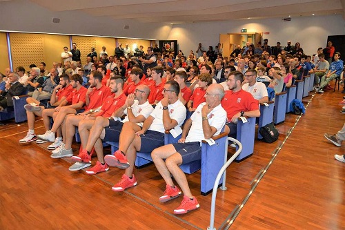 La seconda parte dell’evento ha visto la presentazione della prima squadra, capitanata da Stefano Rajola. Il pubblico ha potuto così salutare i protagonisti dello scorso anno e vedere da vicino i nuovi innesti, mentre sullo schermo ha osservato con interesse il bellissimo video di Lorenzo Toro. Le telecamere di Rete 8 hanno ripreso l’intero evento e si sono poi soffermate sulle interviste ai protagonisti della squadra, in particolare al confermatissimo Coach Giorgio Salvemini.