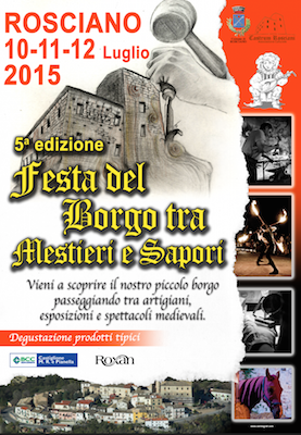 ROSCIANO (PE) – É prevista per il 10, 11 e 12 luglio 2015 la quinta edizione della “Festa del Borgo tra mestieri e sapori” organizzata dall’associazione culturale “Castrum Rosciani”. La manifestazione si terrà nel centro storico di Rosciano. Un vero e proprio tuffo nel Medioevo tra giochi con fuoco, musici, arcieri e sbandieratori e degustazione di prodotti tipici tra cui il menù “venerem asparagus”, a base di asparagi.