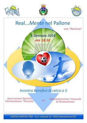 MONTESILVANO (PE) – L’Amministrazione Comunale scende in campo e lo fa per partecipare ad un incontro benefico di Calcio a 5. Martedì 5 gennaio, alle 18.30, presso il Centro Trisi, si terrà “Real…Mente nel Pallone”. La manifestazione sportiva, organizzata dal consigliere Enea D’Alonzo, vedrà gli amministratori comunali sfidarsi con i ragazzi dell’associazione sportiva dilettantistica Percorsi. «Questi speciali ragazzi – spiega D’Alonzo – si allenano due volte a settimana gratuitamente all’interno del centro sportivo Trisi. Si tratta di una realtà molto importante per il nostro territorio che ha messo in evidenza gli effetti benefici di uno sport come il calcio su alcune patologie particolarmente delicate».