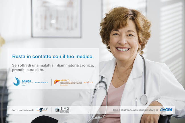 Nasce cosi “Resta in contatto con il tuo medico”, la campagna promossa da ANMAR (Associazione Nazionale Malattie Reumatiche) e APIAFCO (Associazione Psoriasici Italiani Amici della Fondazione Corazza), realizzata con il contributo non condizionante di Amgen, proprio per esortare i pazienti con artrite psoriasica, artrite reumatoide e psoriasi, a mantenere il contatto con il proprio medico di riferimento, senza trascurare l’aderenza alla terapia.