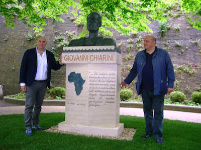 Sulla parte bassa del monumento figura una immagine in metallo zincato e verniciato del continente africano, ponendo in evidenza il fiume Nilo e i Laghi Equatoriali meta dell’ultima spedizione dell’esploratore e luogo della sua morte avvenuta nell’ottobre del 1879. Sul manufatto sono incise anche le ultime parole che la tradizione vuole siano state pronunciate da Chiarini prima di morire.