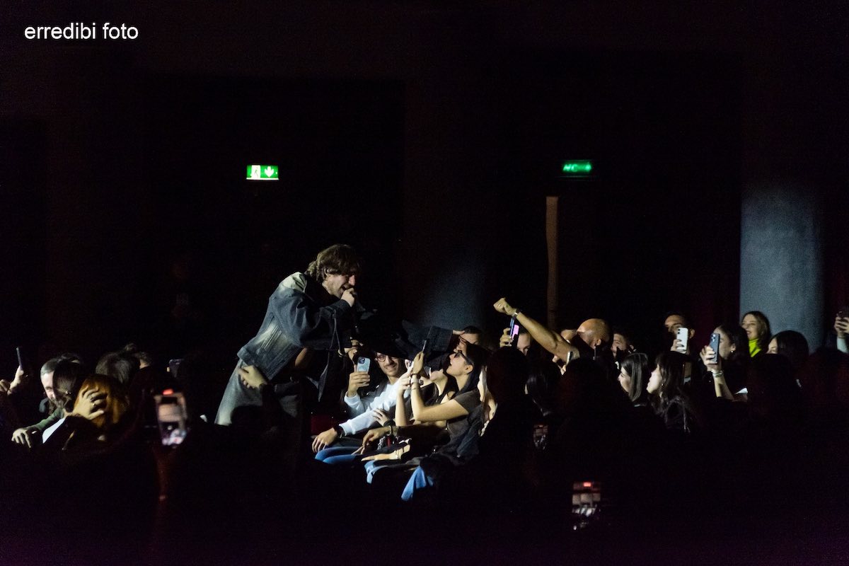 Lo spettacolo è stato diviso in due atti, con una scenografia essenziale ma potente: una scala sullo sfondo nella prima parte e una gabbia nella seconda. Rkomi ha alternato momenti musicali a monologhi personali, raccontando la sua evoluzione artistica e il senso di appartenenza ritrovato grazie alla musica. La sua scelta di scendere più volte tra il pubblico ha rafforzato la dimensione teatrale e intima del concerto, trasformando la platea in parte integrante della performance.
