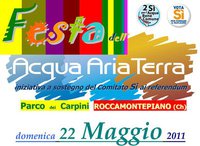 ROCCAMONTEPIANO (CH) – Si terrà domani ,22 maggio, presso il Parco dei Carpini a Roccamontepiano la Festa dell’Acqua,dell’Aria e della Terra ,organizzata dal Comitato valli Alento e Foro per il sì all’ACQUABENECOMUNE e dal Comune di Roccamontepiano in collaborazione con il Comitato duesì per l’acquabenecomune di Chieti. Il programma ricco e variegato è articolato in iniziative diversificate,ideate per tutti i gusti e per tutte le età ma con un unico filo logico il sostegno alla campagna referendaria.