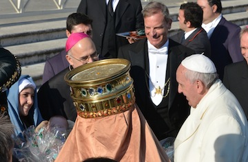 ROMA – “Quest’anno il Natale è arrivato in anticipo”. É così che Papa Francesco ha salutato i figuranti del Presepe vivente di Rivisondoli nell’udienza di ieri in piazza San Pietro. Con il suo largo sorriso, il Papa ha chiesto a Greta Cipolla, la ragazza di 14 anni che impersona la Madonnina nell’edizione di quest’anno, quale fosse il suo stato d’animo nel vestire un ruolo così impegnativo. E lei con la naturalezza che contraddistingue i giovani della sua età ha risposto: “è la cosa più bella che mi poteva accadere”. Anche il piccolo Matthias, l’ultimo nato dell’anno a Rivisondoli, al quale la tradizione del Presepe vivente affida il ruolo di Gesù Bambino, ha avuto la sua parte di coccole dal Papa.