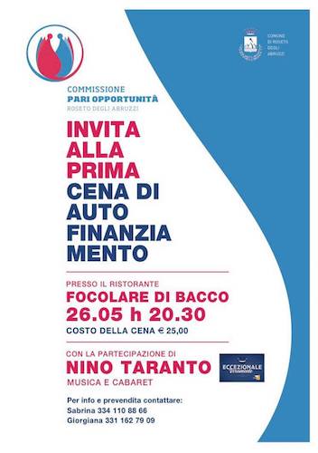 ROSETO DEGLI ABRUZZI (TE) – Venerdì 26 maggio, alle 20.30, al Focolare di Bacco, la Commissione pari opportunità del Comune, ha organizzato una cena di autofinanziamento.