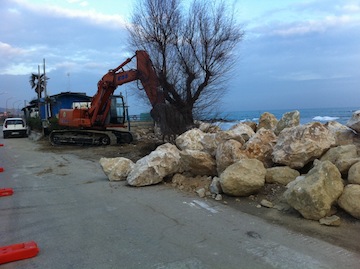 ROSETO DEGLI ABRUZZI (TE) – L’amministrazione comunale di Roseto ha avviato i lavori di protezione del tratto sud del lungomare Trieste. Si tratta di interventi in somma urgenza di rafforzamento delle scogliere a protezione della strada, a seguito dei problemi causati dalle forti mareggiate di novembre e dicembre scorso, che avevano determinato l’accumulo di diverso materiale e reso impercorribile la carreggiata in quel tratto, tempestivamente riaperto dopo l’intervento dei mezzi del Comune.A fine novembre, è stato condotto un sopralluogo congiunto dai tecnici del Servizio Opere marittime della Regione Abruzzo insieme ai tecnici comunali e, in questa sede, si è concordato di effettuare l’intervento per evitare il ripetersi del fenomeno, in occasione delle prossime ondate di maltempo.