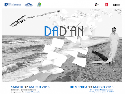 PESCARA – DA D’AN, festival di poesia e arti performative, a cura di Lucia Zappacosta con la direzione scientifica di Franca Minnucci, è un evento itinerante organizzato dall’Associazione Culturale Contemporary in collaborazione con 16 Civico arte contemporanea, il Polo Museale d’Abruzzo e la Presidenza del Consiglio Comunale, che si svolge nella città di Pescara il 12 marzo in occasione dell’anniversario della nascita di Gabriele D’Annunzio.