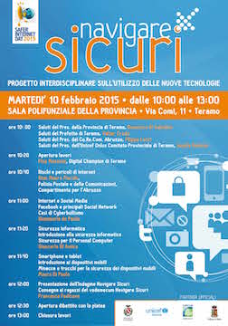 TERAMO – Un gruppo di professionisti di informatica, di rete e di social (che hanno collaborato a titolo gratuito); l’Unicef, il Corecom e la Provincia di Teramo, oggi,10 febbraio 2015, celebrano il Safer Internet Day incontrando 300 studenti alla Sala Polifunzionale di Teramo per parlare di rete e sicurezza.