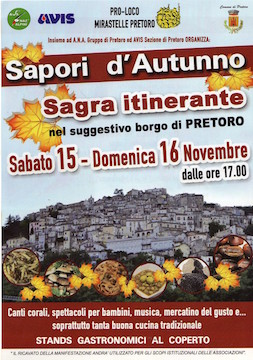 PRETORO (CH) – Sabato 15 e domenica 16 novembre in località Pretoro, ci sarà la sagra itinerante chiamata “Sapori d’Autunno”. Il paesino arroccato sulla Majella si vestirà a festa ed il fiabesco centro storico si animerà tra profumi dei caratteristici odori autunnali e piacevole musica. Protagonista della due giorni sarà la buona cucina tradizionale, servita nei diversi stands gastronomici al coperto, accompagnata da musica di sottofondo e dai sorrisi affabili della gente. Tra le specialità salumi, formaggi, tartufi, miele, marmellate e dolci tra cui la tipica “Torta del Lupo”. Presenti spettacoli per grandi e piccini a partire dalle ore 18 mentre alle ore 21.30 nella Chiesa di San Nicola saranno invece offerte esibizioni di corali folkloristiche. L’organizzazione dell’evento sarà curata nei minimi dettagli dai componenti delle associazioni pretoresi AVIS e A.N.A. Il ricavato sarà destinato agli scopi istituzionali delle due associazioni.
