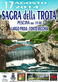 PESCINA (AQ) – Oggi, 17 agosto, presso il Largo Proia di Fonte Vecchia a Pescina appuntamento con la Sagra della Trota. Dalle ore 8 si sta svolgendo la gara di pesca sportiva mentre dalle 19 torna un evento organizzato in collaborazione con la Città di Pescina, il Circolo Pesca Fabrizio Di Nino e l’Antica Locanza del Giovenco.