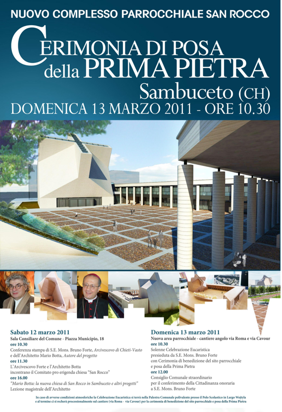 SAMBUCETO (CH) – Il prossimo 13 marzo, alla presenza di autorità politiche, militari, civili e religiose, oltre che dell’intera comunità di San Giovanni Teatino, si celebrerà solennemente la “posa della prima pietra” del complesso parrocchiale di S. Rocco in Sambuceto, secondo l’idea progettuale dell’Architetto Mario Botta di Lugano.