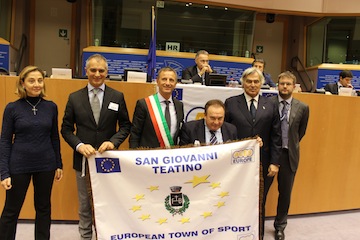 SAN GIOVANNI TEATINO (CH) – Il Comune di San Giovanni Teatino è ufficialmente “European Town of Sport”: il riconoscimento, concesso dall’ACES (Associazione delle Città Europee dello Sport), è stato consegnato nelle mani del sindaco, Luciano Marinucci, e dell’assessore allo Sport, Paolo Cacciagrano, al Parlamento Europeo di Bruxelles, nel corso di una cerimonia in cui sono state nominate altre trenta capitali, città e cittadine di tutto il continente.