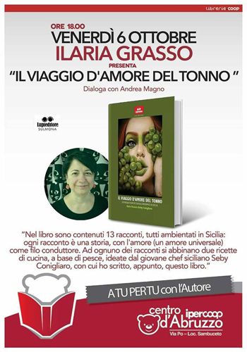 SAN GIOVANNI TEATINO – Venerdì 6 ottobre 2017, alle ore 18.00, per la rassegna A TU PER TU CON L’AUTORE, presso la Libreria Coop del Centro D’Abruzzo, in San Giovanni Teatino, Ilaria Grasso presenterà il suo libro dal titolo “Il Viaggio d’amore del tonno – Un viaggio d’amore enogastronomico in Sicilia”, pubblicato da Lupi Editore, di Sulmona.